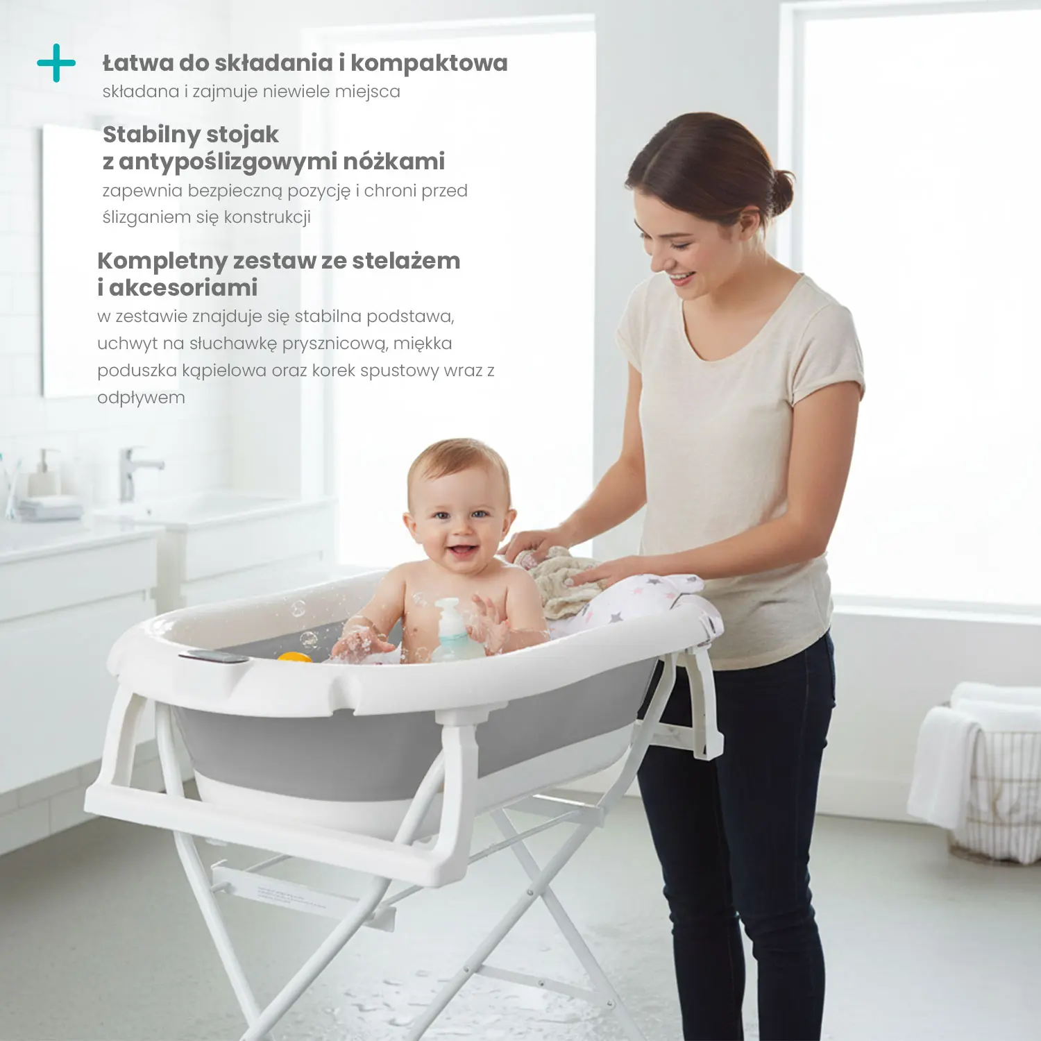 Wanienka składana Premium z poduszką, odpływem i termometrem + składany stojak